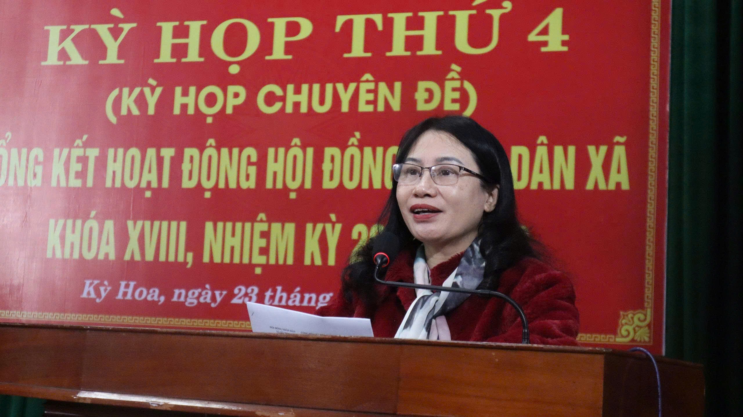 Phát biểu bế mạc kỳ họp, đồng chí Trần Thị Huyền - Bí thư Đảng ủy, Chủ tịch HĐND xã ghi nhận và biểu dương nỗ lực, đóng góp của Thường trực HĐND, các ban HĐND xã, các tổ đại biểu và từng đại biểu HĐND xã và cảm ơn những đóng góp quan trọng của các đồng chí lãnh đạo, các vị đại biểu HĐND, các cơ quan, đơn vị và đặc biệt là sự tin tưởng, đồng hành, ủng hộ của cử tri và Nhân dân xã Kỳ Hoa trong suốt nhiệm kỳ vừa qua.