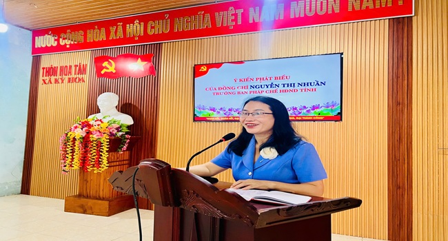 Trưởng ban Pháp chế HĐND tỉnh Nguyễn Thị Nhuần nhấn mạnh: “Để tiếp tục phát huy tinh thần đoàn kết, thời gian tới, Ban công tác Mặt trận, Chi bộ và Ban chấp hành thôn cần làm tốt hơn nữa công tác tuyên truyền, vận động Nhân dân chấp hành tốt chủ trương của Đảng, chính sách pháp luật của Nhà nước; phát huy dân chủ ở cơ sở, khơi dậy sức mạnh đại đoàn kết toàn dân, tích cực tham gia các phong trào thi đua, chăm lo phát triển kinh tế, bảo vệ môi trường, xây dựng đời sống văn hóa mới ở khu dân cư".